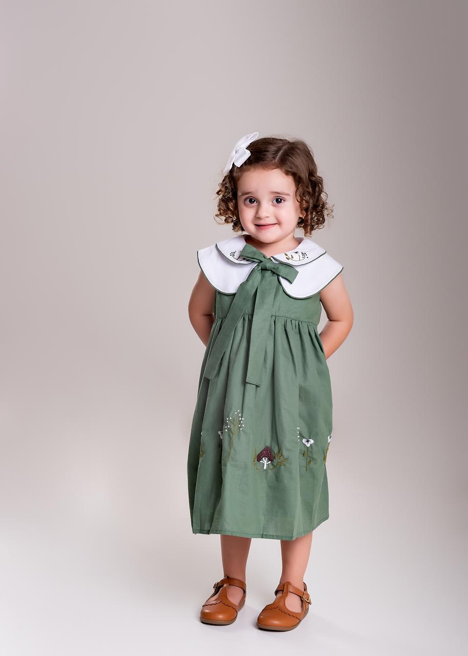Vestido bordado a mão 100% algodão, forrado, abertura nas costas em botões, gola branca dupla bordada e laço frontal gola