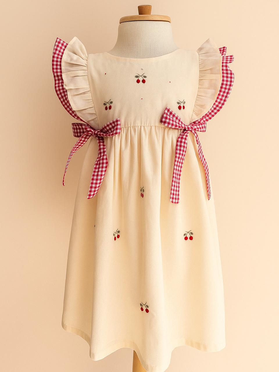 Vestido 100% algodao forrado, feito artesanalmente com bordados manuais de cerejinhas que tornam cada peça unica. O laço na cintura em xadrez vermelho trazem um toque atemporal.