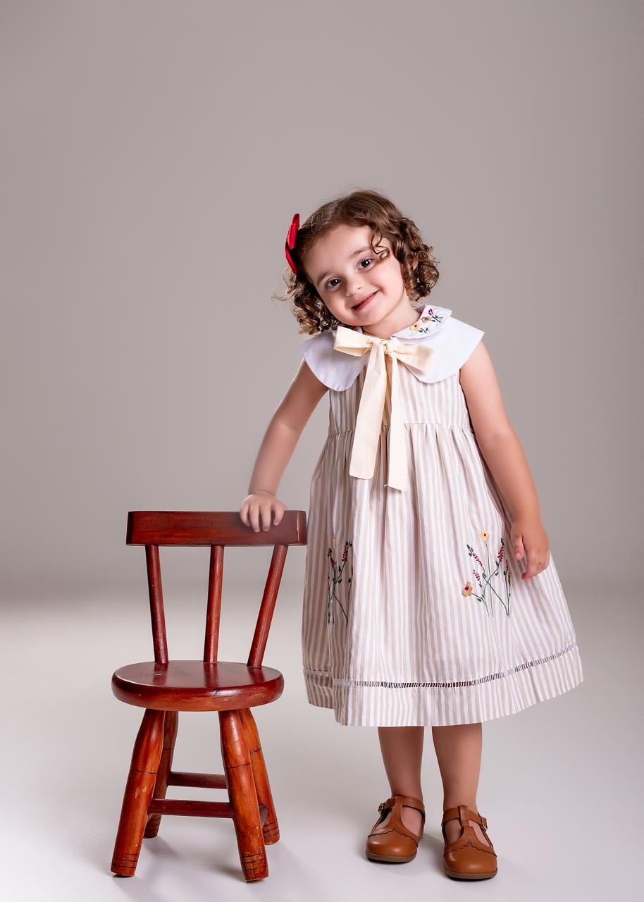 VESTIDO 100% ALGODÃO BORDADO A MÃO, FORRADO,TECIDO LISTRADO BEGE BORDADO EM FLORES NOS TONS DE VERDE E VERMELHO, GOLA BRANCA DUPLA BORDADA E LAÇÕ FRONTAL NA GOLA .